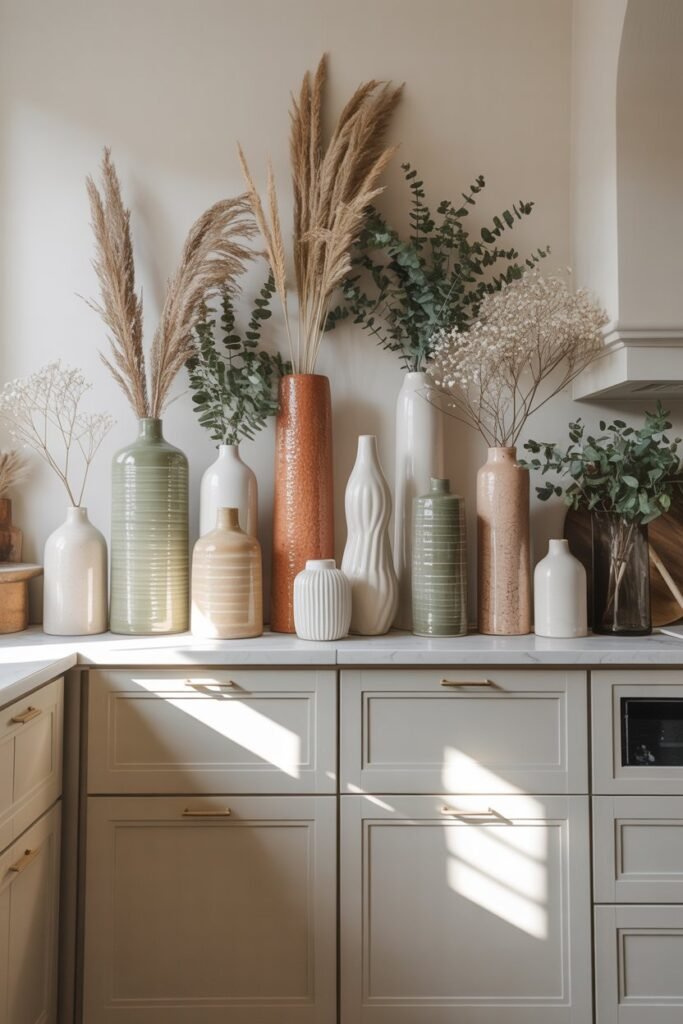 The area above kitchen cabinets is perfect for adding style, color, and personality — from subtle greenery to seasonal accents or decorative collections.