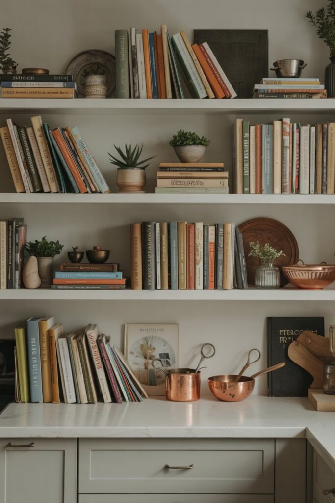 Pro Tip: I often pair cookbooks with small potted plants or decorative bowls to create a curated, layered display.