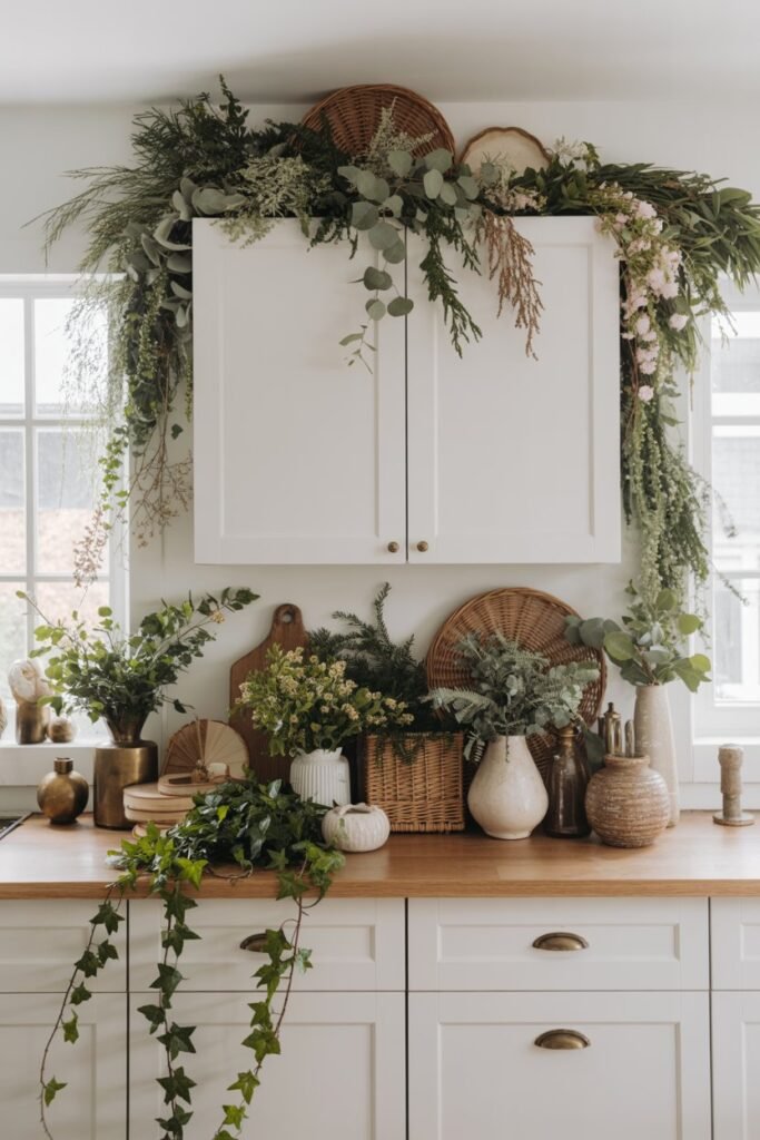 Adding seasonal greenery or faux florals above cabinets is one of my favorite ways to refresh the kitchen regularly.