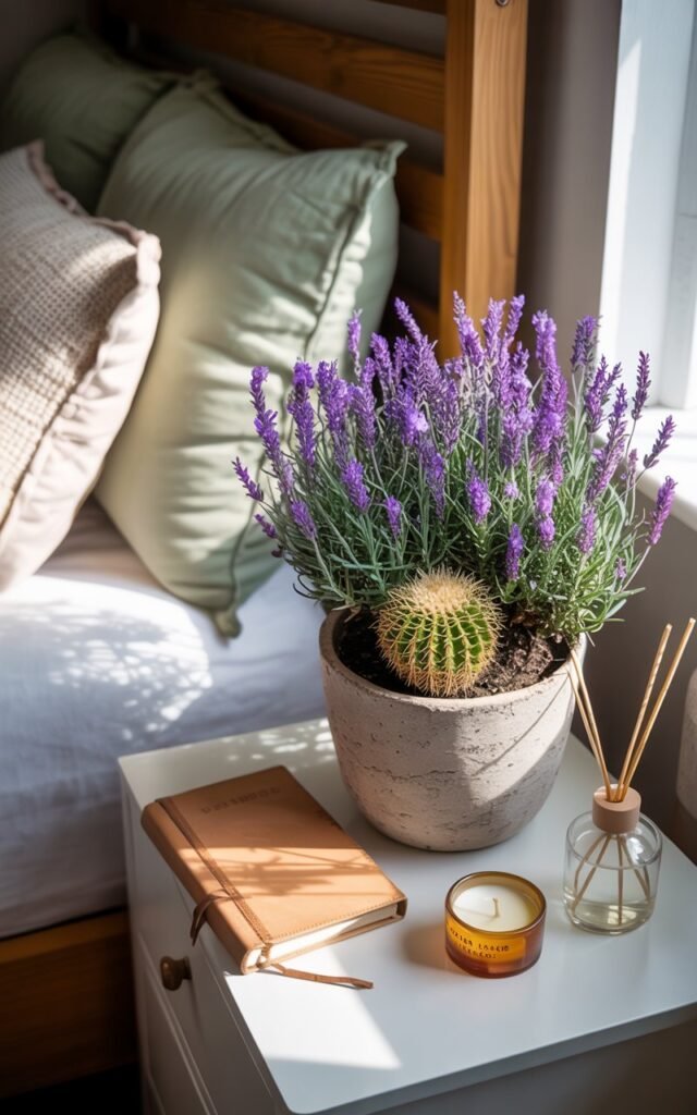 The cactus brings energy and structure to the room, while lavender adds a soft, calming influence.