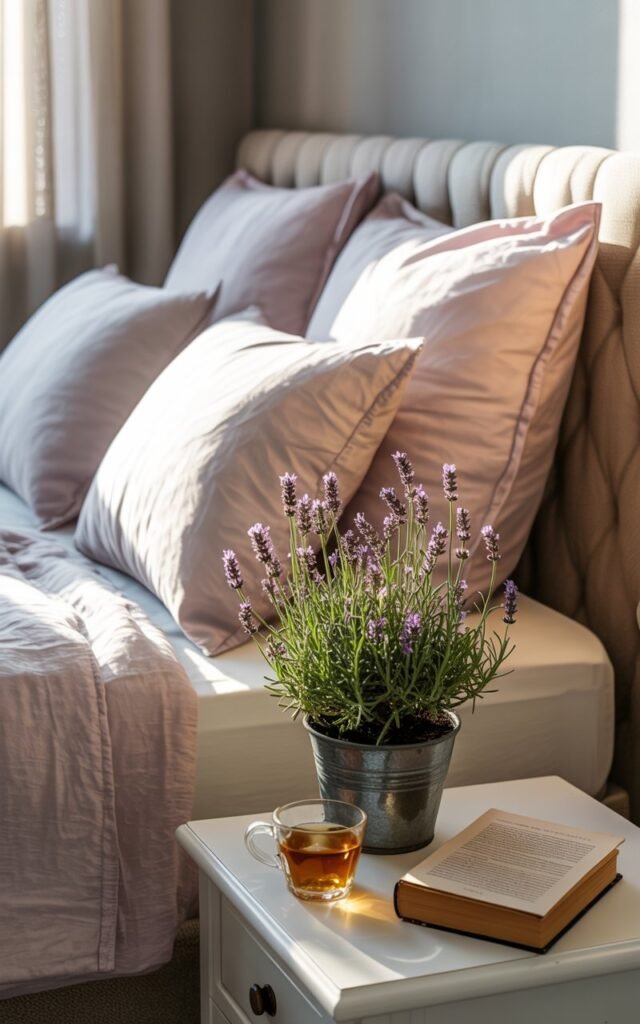 I keep a small lavender plant on my nightstand. Each night, I lightly brush my fingers along the leaves, releasing a gentle scent.