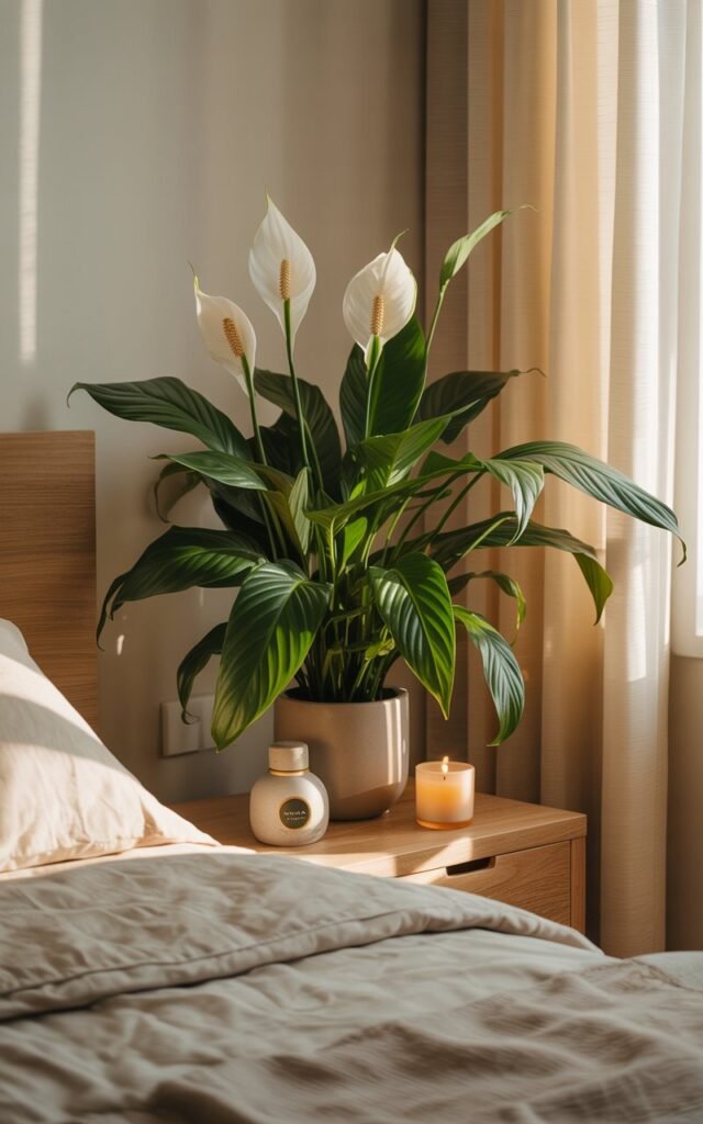 I place a medium peace lily in a corner where it gets filtered sunlight. The plant naturally filters toxins from the air, which I noticed makes waking up less stuffy and my room feel lighter.