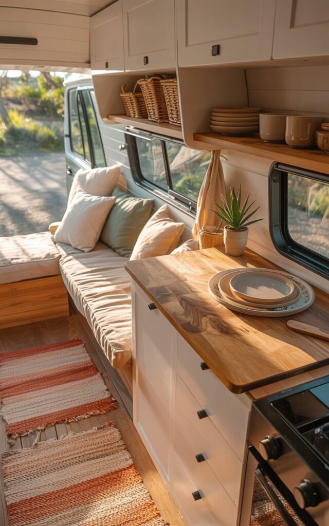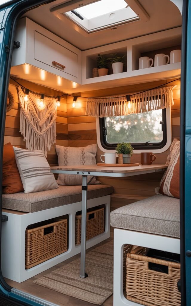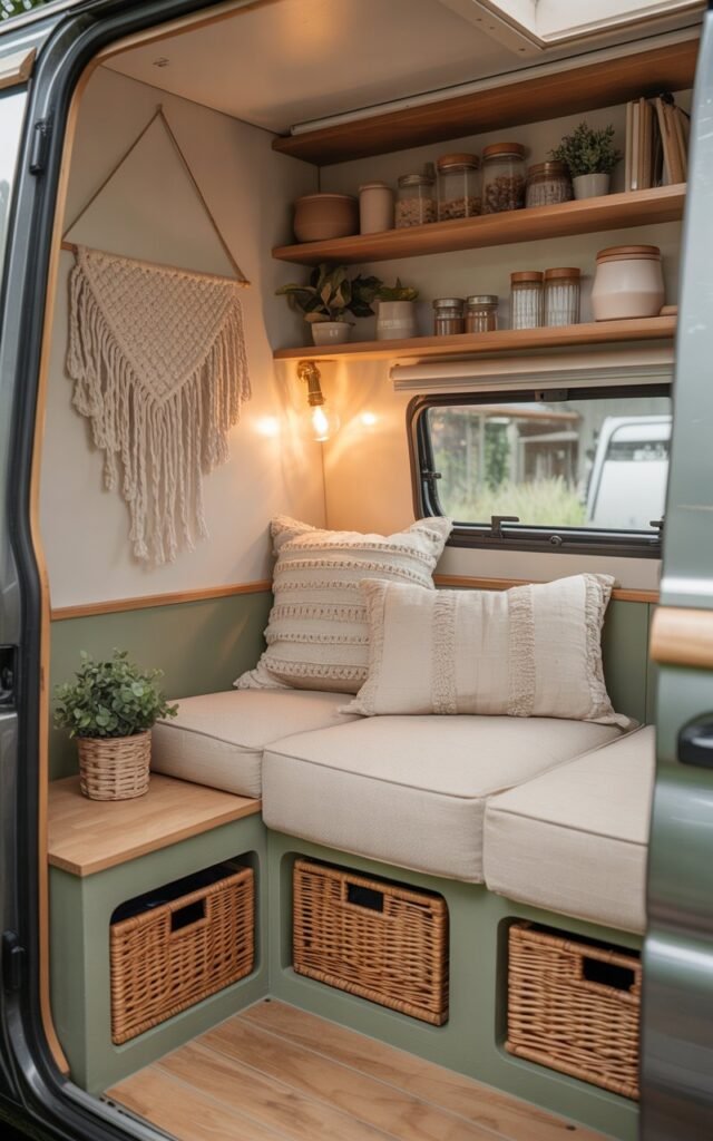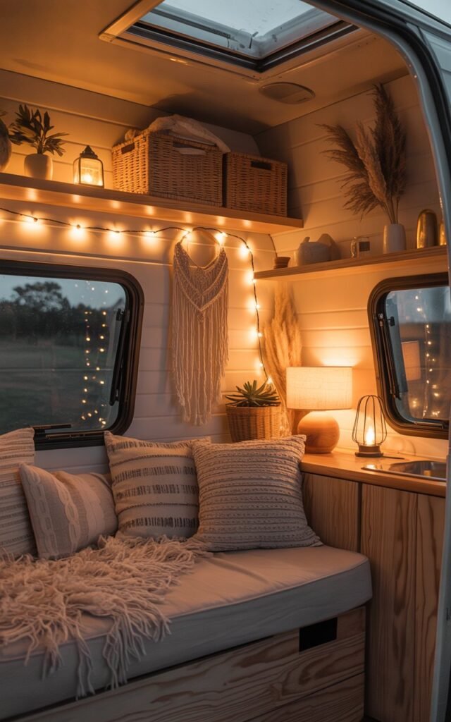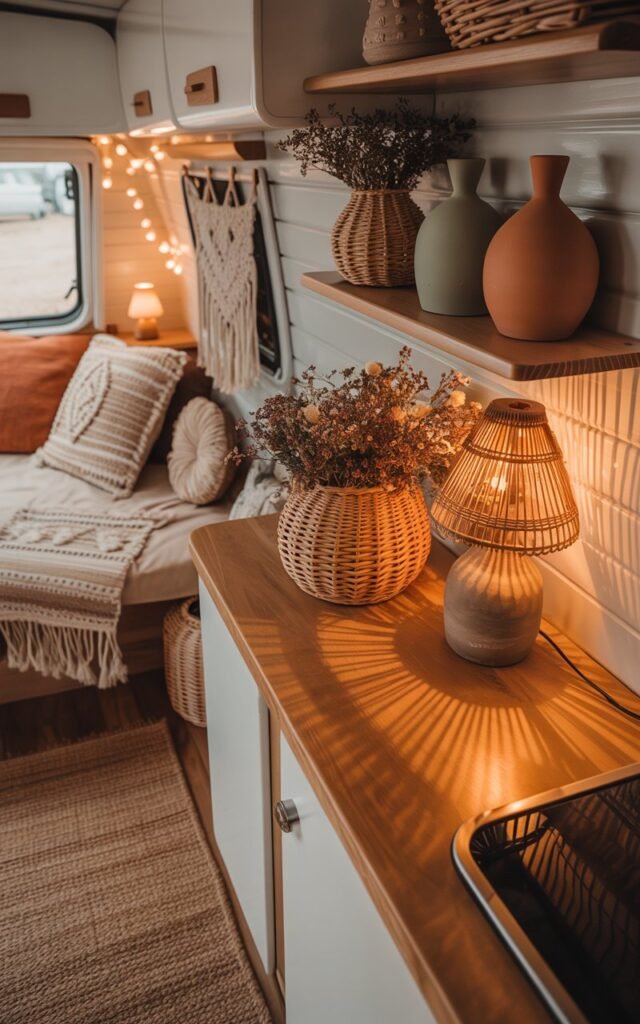 - Natural materials: Wood, rattan, wicker, and jute add warmth and an organic feel that softens the camper’s hard surfaces.