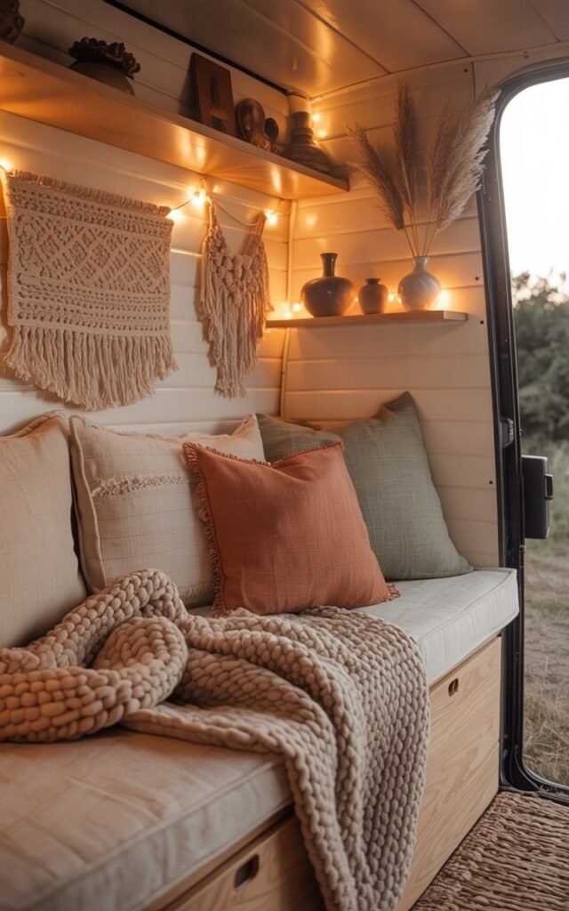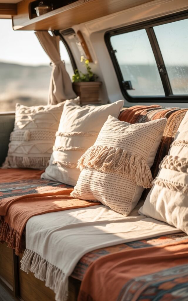 - Natural, tactile materials like wood, cotton, linen, jute, and wicker that soften hard camper surfaces