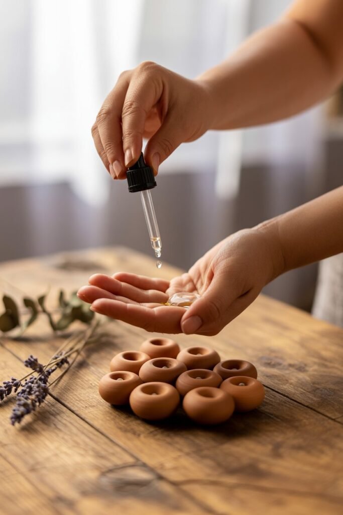 Once your stones are completely dry, place them on a clean plate or tray. Add 3–5 drops of essential oil directly onto each stone. The clay will absorb the oil slowly, releasing the scent over several days.
