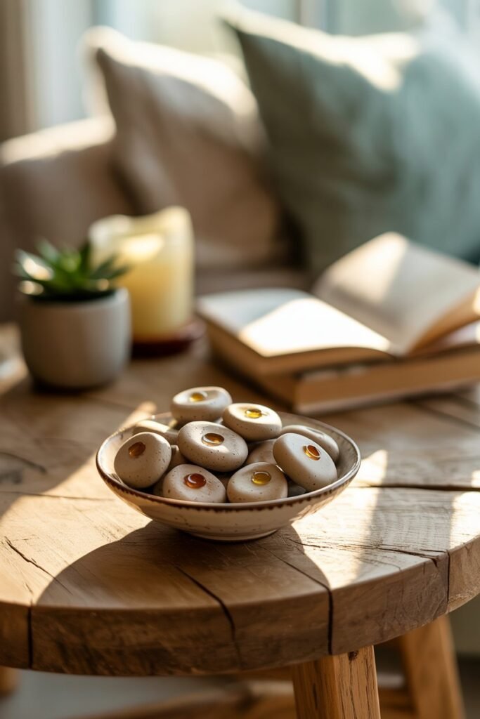 Gather a few stones and place them in small ceramic dishes, glass jars, or on marble trays. I often scatter a few in my entryway to welcome guests with a soft, clean scent.