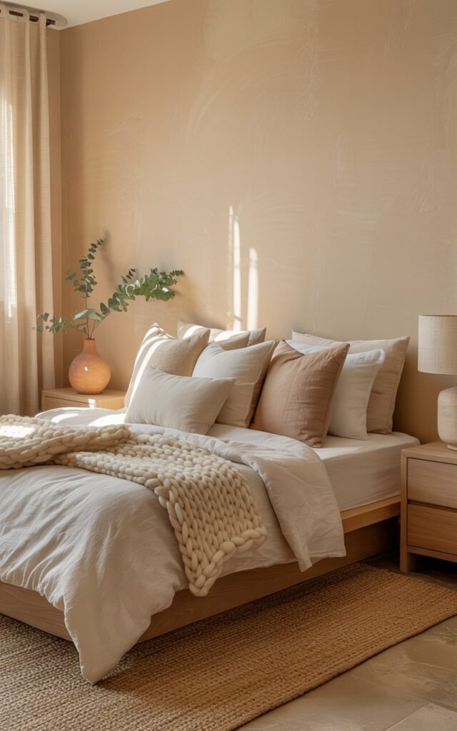 Neutral tones like creamy beige create versatility, muted greens like sage bring calm, and warm terracotta adds energy without overstimulation.