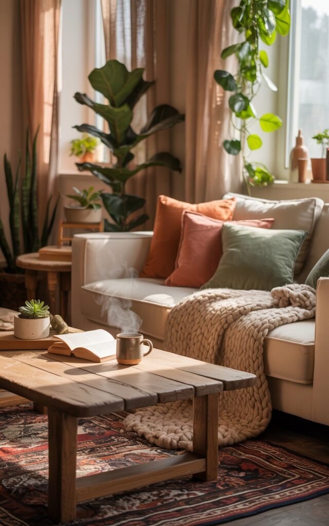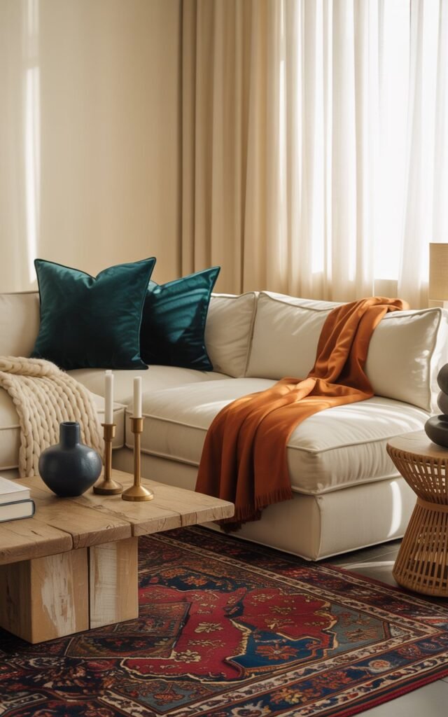 Throw pillows in burnt orange, muted mustard, and deep olive, along with a few colorful vases and rugs, added warmth without feeling forced.