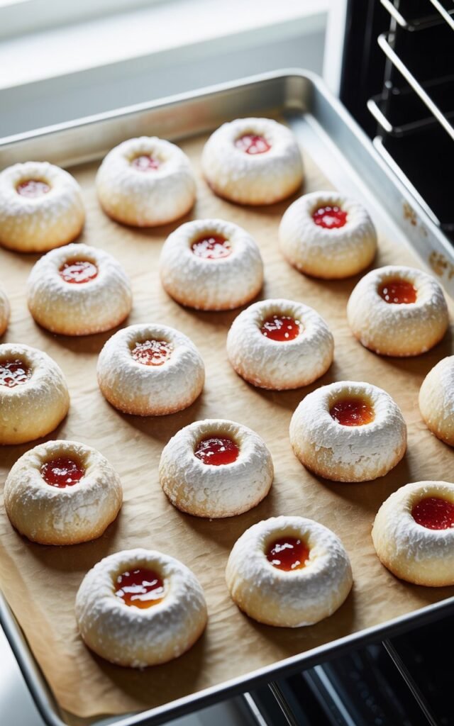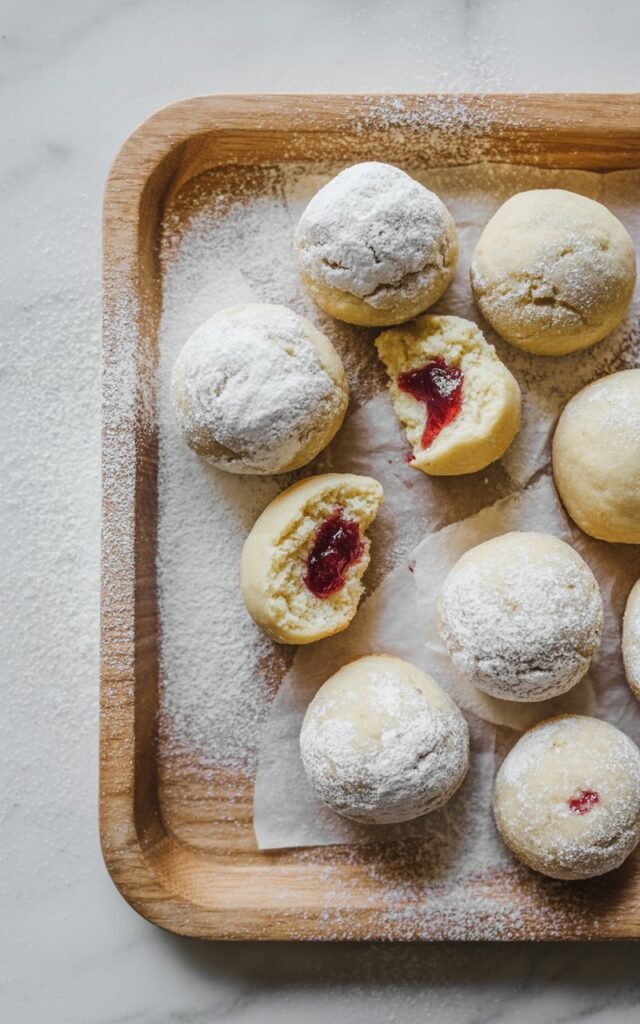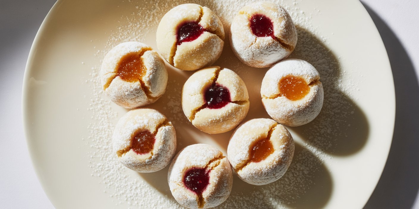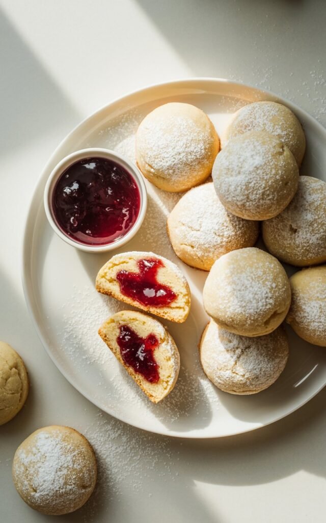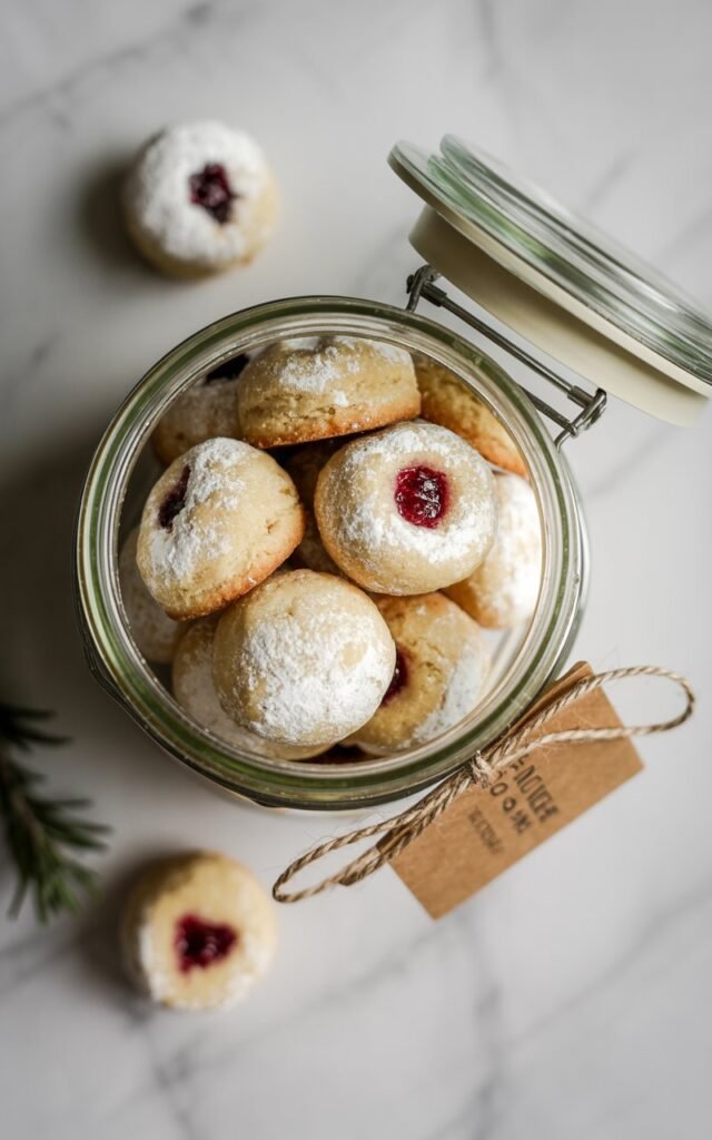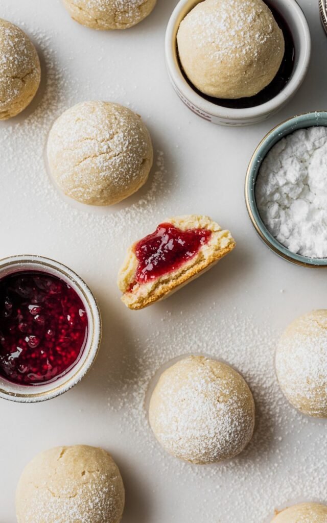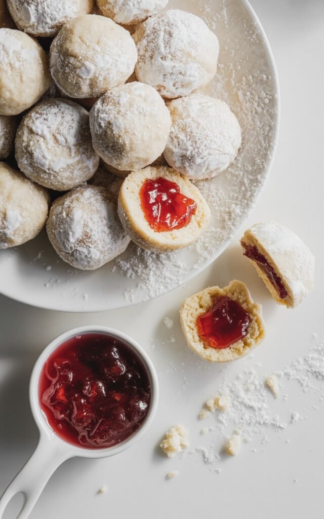 These jam-filled snowball cookies are buttery, tender, lightly sweet, and finished with a soft powdered sugar coating that looks like fresh snow.