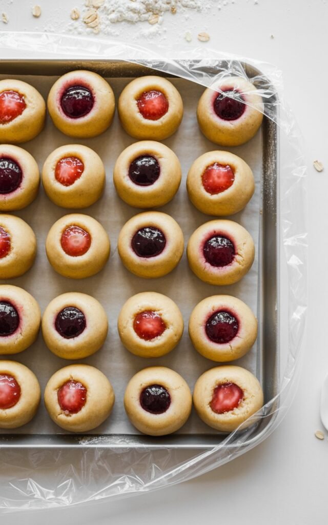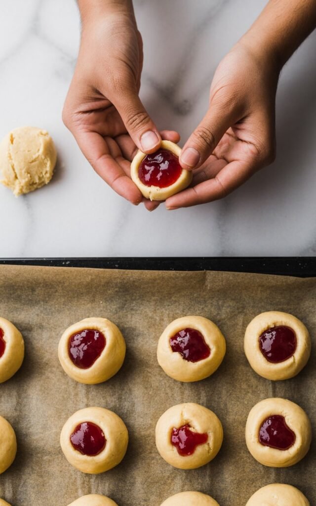 Press your thumb gently into the center of each ball to create a pocket. Add a small spoonful of jam (less is more here).