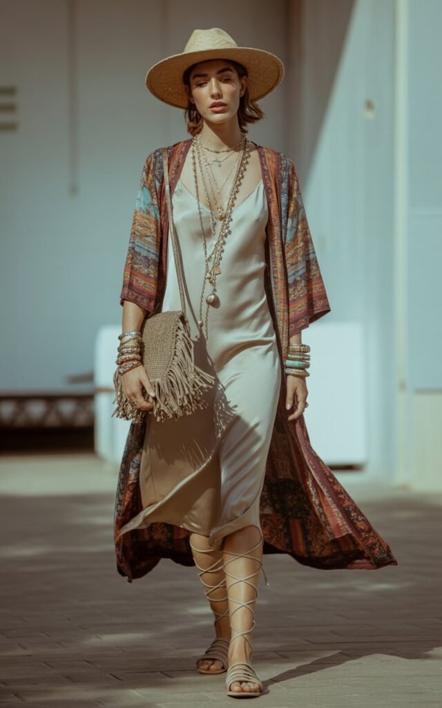 One of my absolute favorite ways to channel a free-spirited boho vibe is by layering a flowy kimono jacket over a lightweight slip dress.