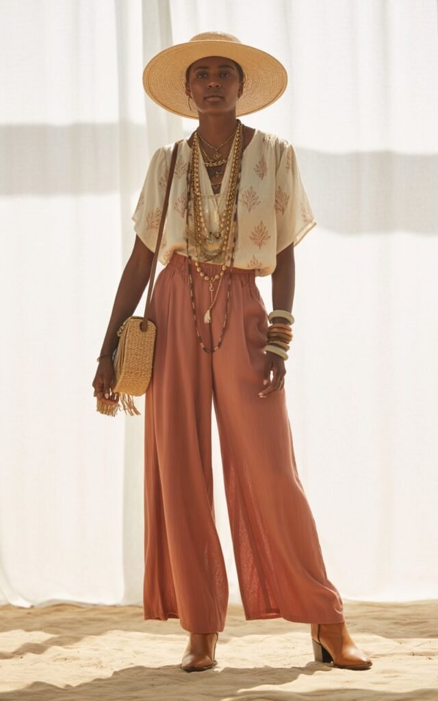 For cooler weather or a slightly edgy twist, chunky ankle boots balance the flowing pants while staying completely boho.