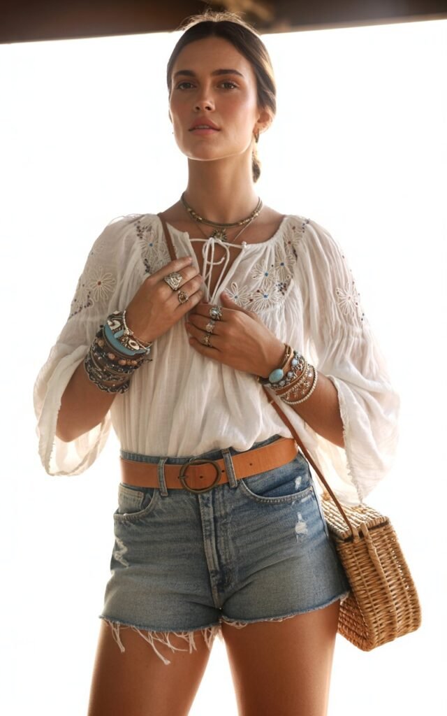 For warmer days, I absolutely love pairing high-waisted shorts with an oversized peasant blouse—it’s one of my go-to casual boho looks.