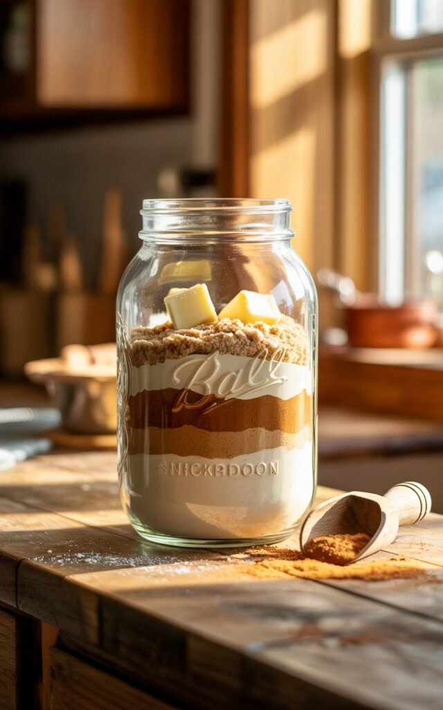 Layer flour, sugars, and cream of tartar for visual interest. Sprinkle cinnamon in between layers for a subtle pattern. Attach instructions to mix wet ingredients like butter, eggs, and vanilla before combining with the dry layers.