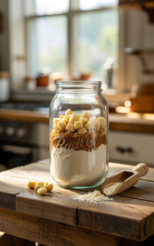 Add a few chocolate chunks or mini chocolate chips on top for a decorative effect. Tie a ribbon or small tag with “Bake Me” for an extra personalized touch that makes the jar feel thoughtful and gift-ready.