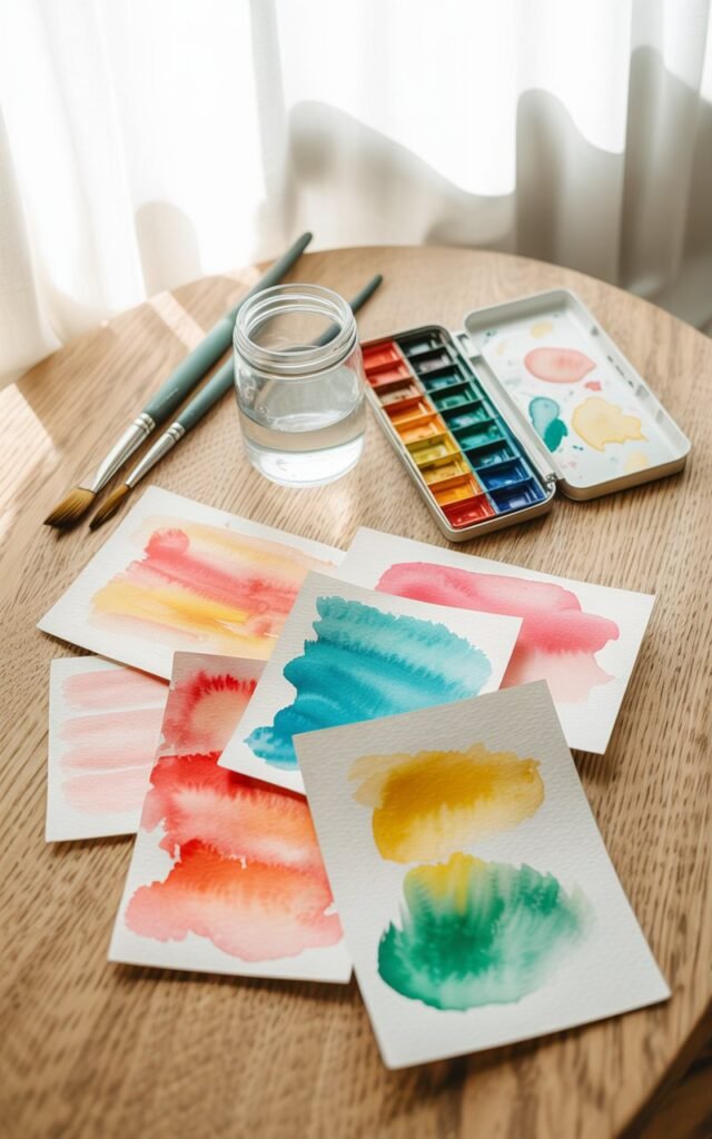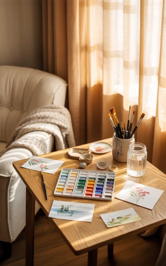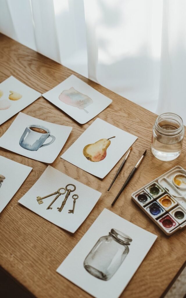 I don’t overcomplicate my setup. A basic watercolor palette, a dependable brush, paper towels, and a cup for water are all I need. Everything fits into a small space so I can begin and end sessions easily.