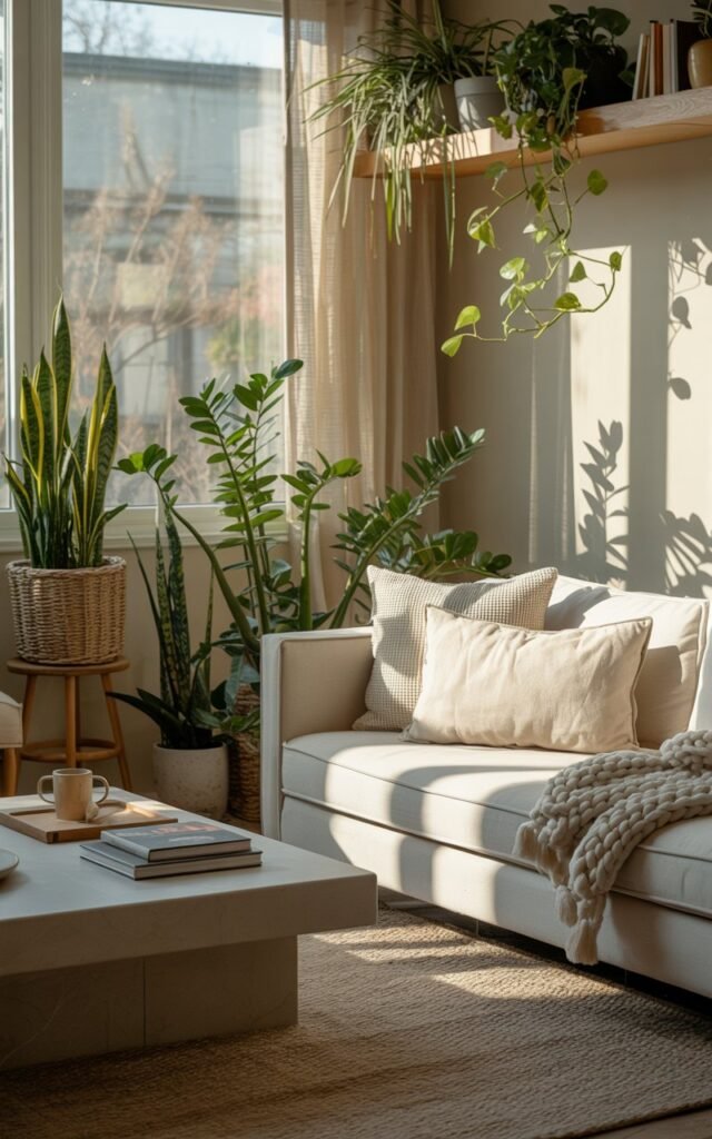 What changed everything for me was discovering either high-quality faux plants that actually mimic nature—or better yet, easy-to-care-for real plants like snake plants, pothos, ZZ plants, or succulents.