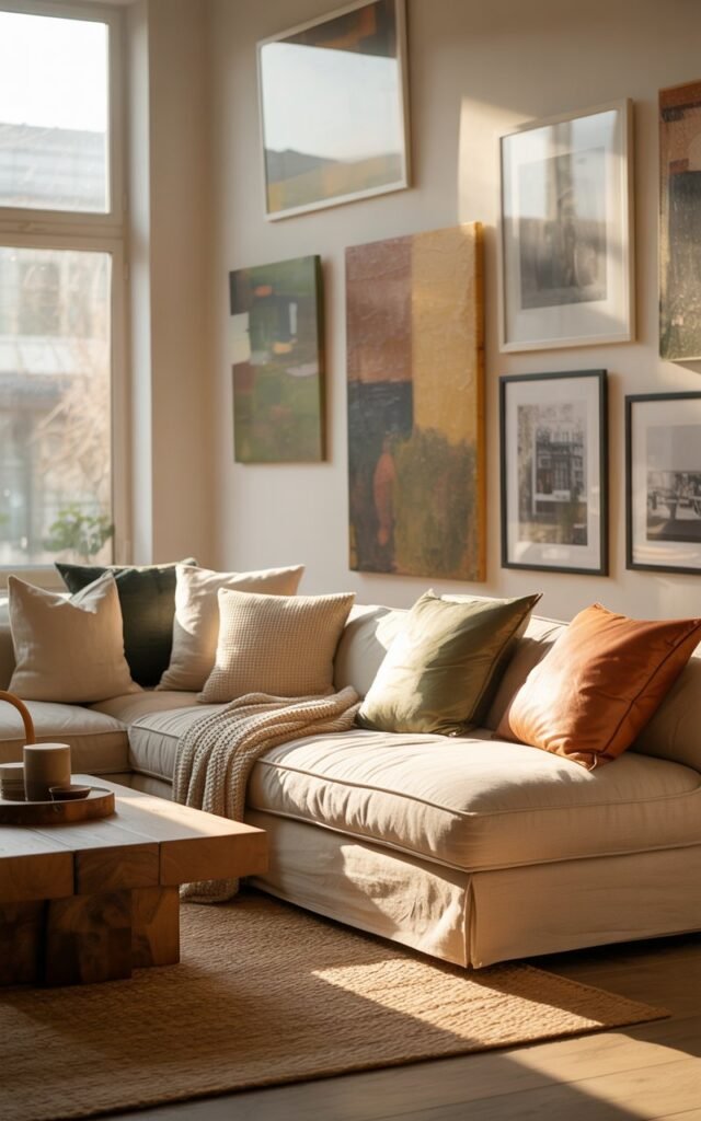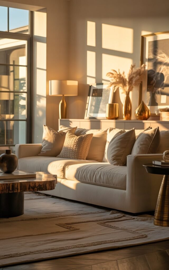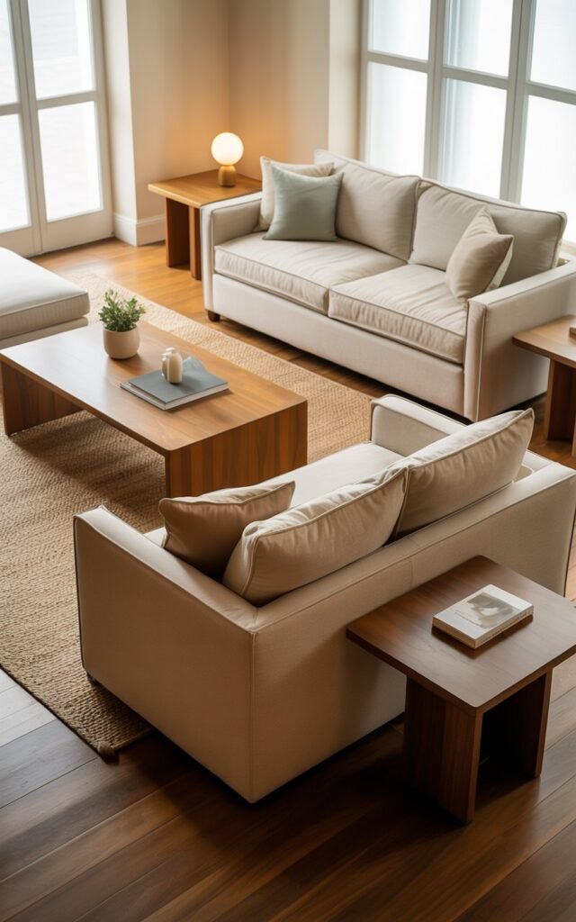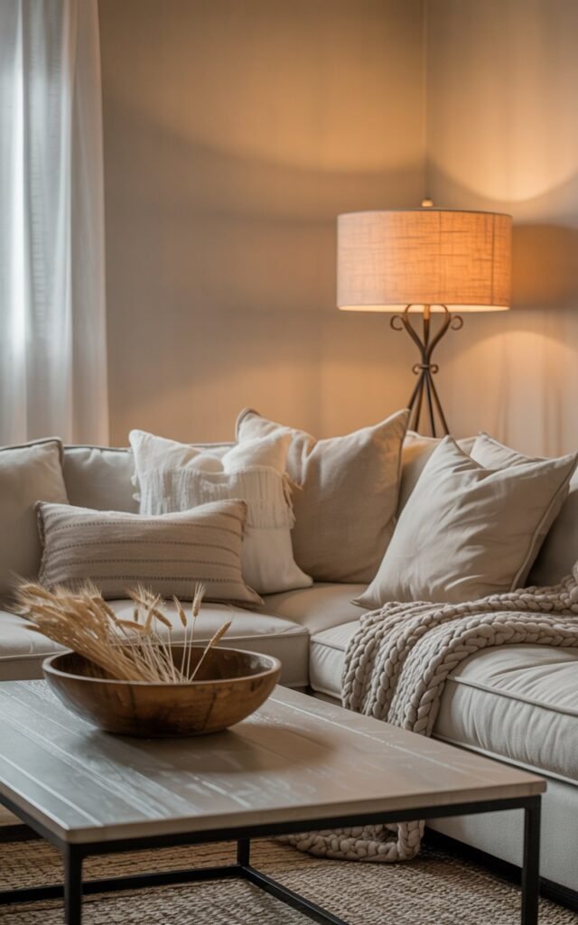What changed everything for me was layering textures and warmth. Soft creams, warm beiges, greige tones, and natural woods brought depth without overwhelming the space.