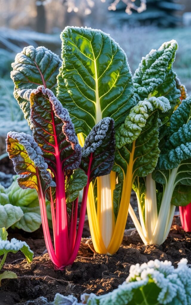 Swiss chard looks delicate but surprises you. It tolerates cold well and bounces back after frost.