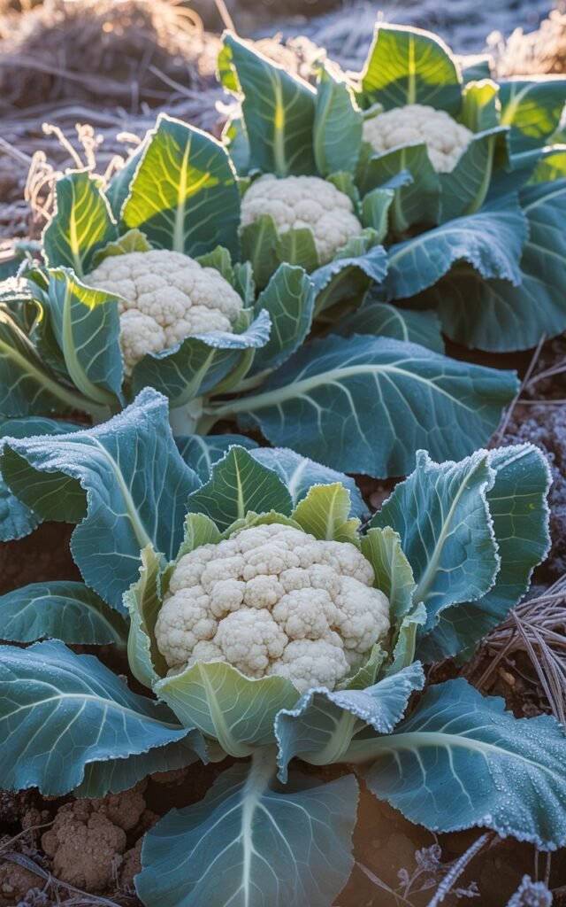 Cauliflower handles frost better than most people expect. It prefers cool conditions and develops tighter, cleaner heads when temperatures drop.